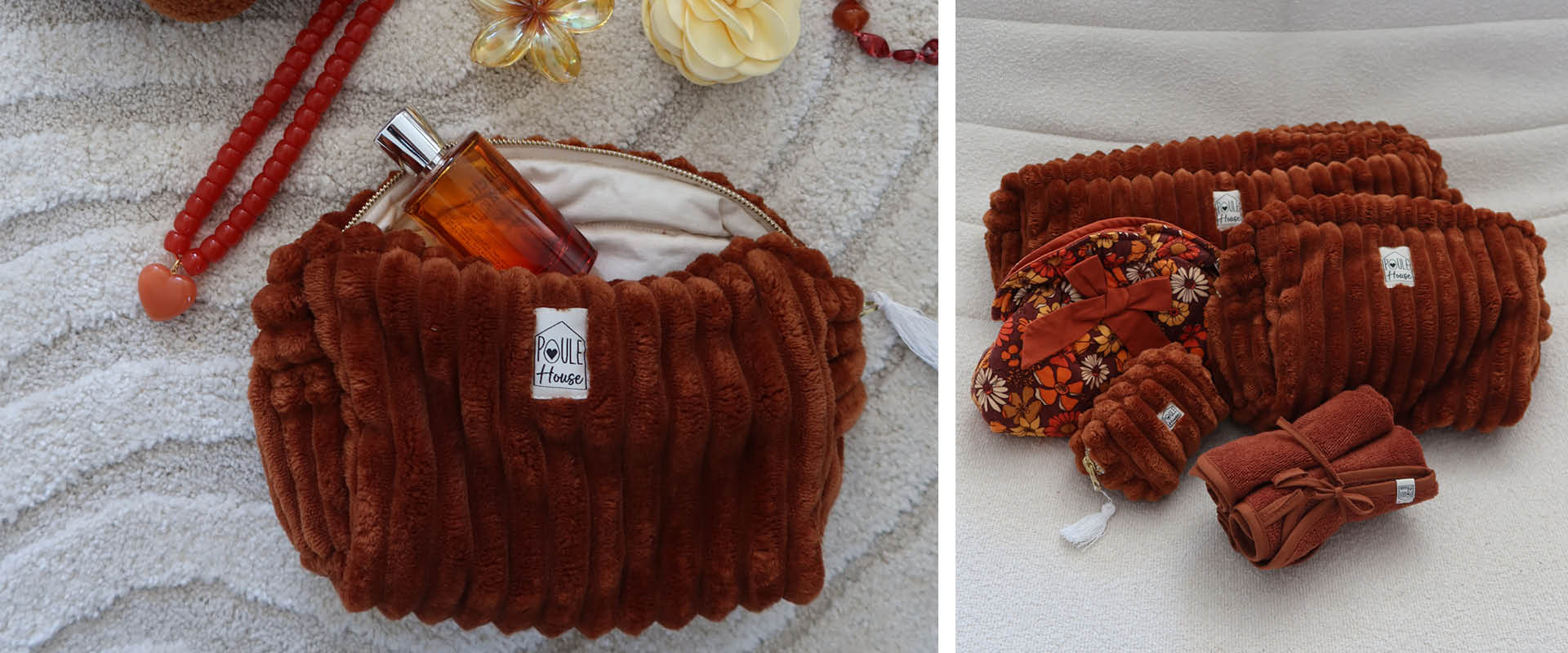 Trousse de toilette bohème ou matelassée, masque de sommeil en satin, bandeau de soins, lunch bag stylé, éponge et lavette réutilisables… Tous tes essentiels pour la maison, la beauté et le voyage, éthiques et ultra-chics, t’attendent chez Poule House !