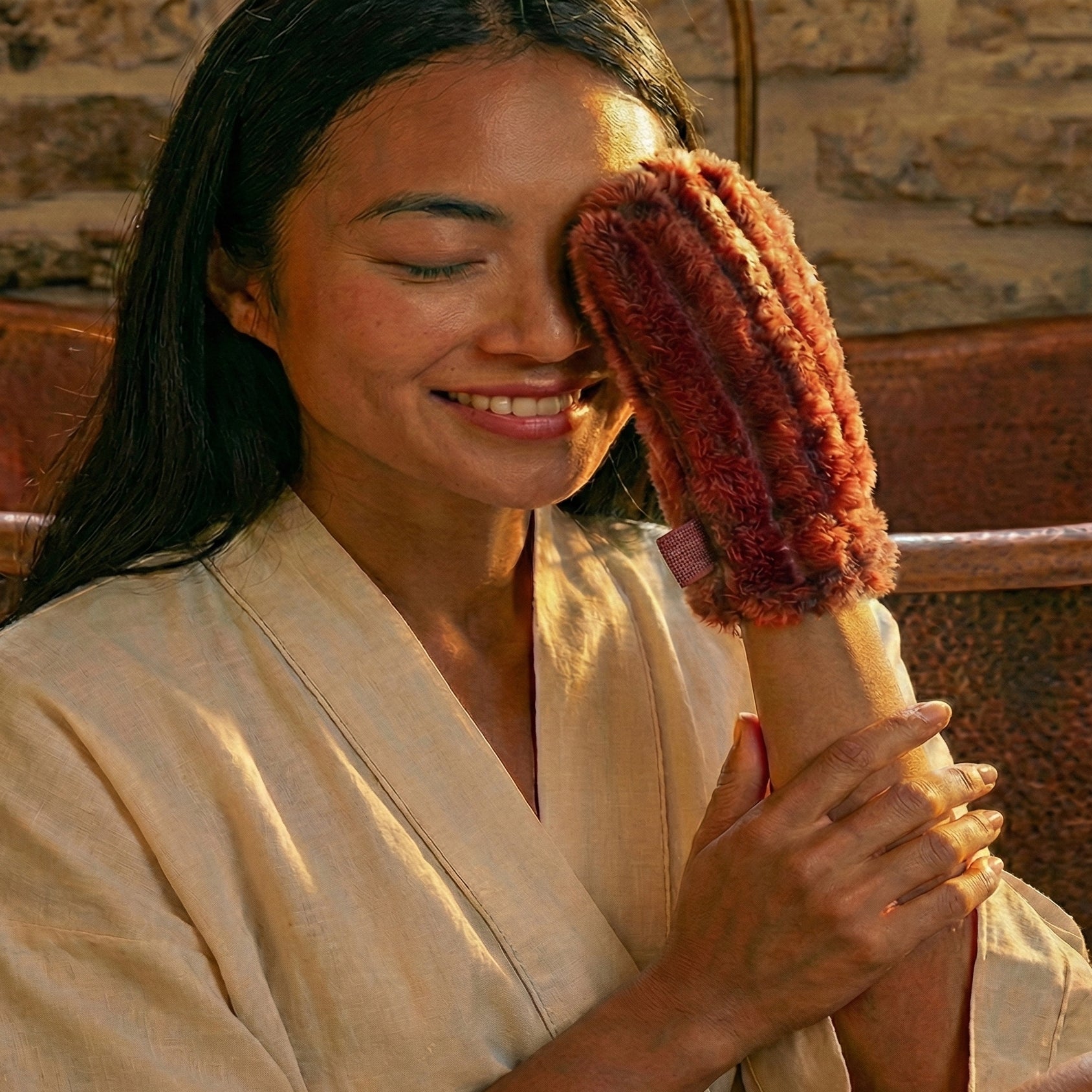 - Face minky côtelé = légère exfoliation pour un nettoyage en profondeur et rincer ton visage