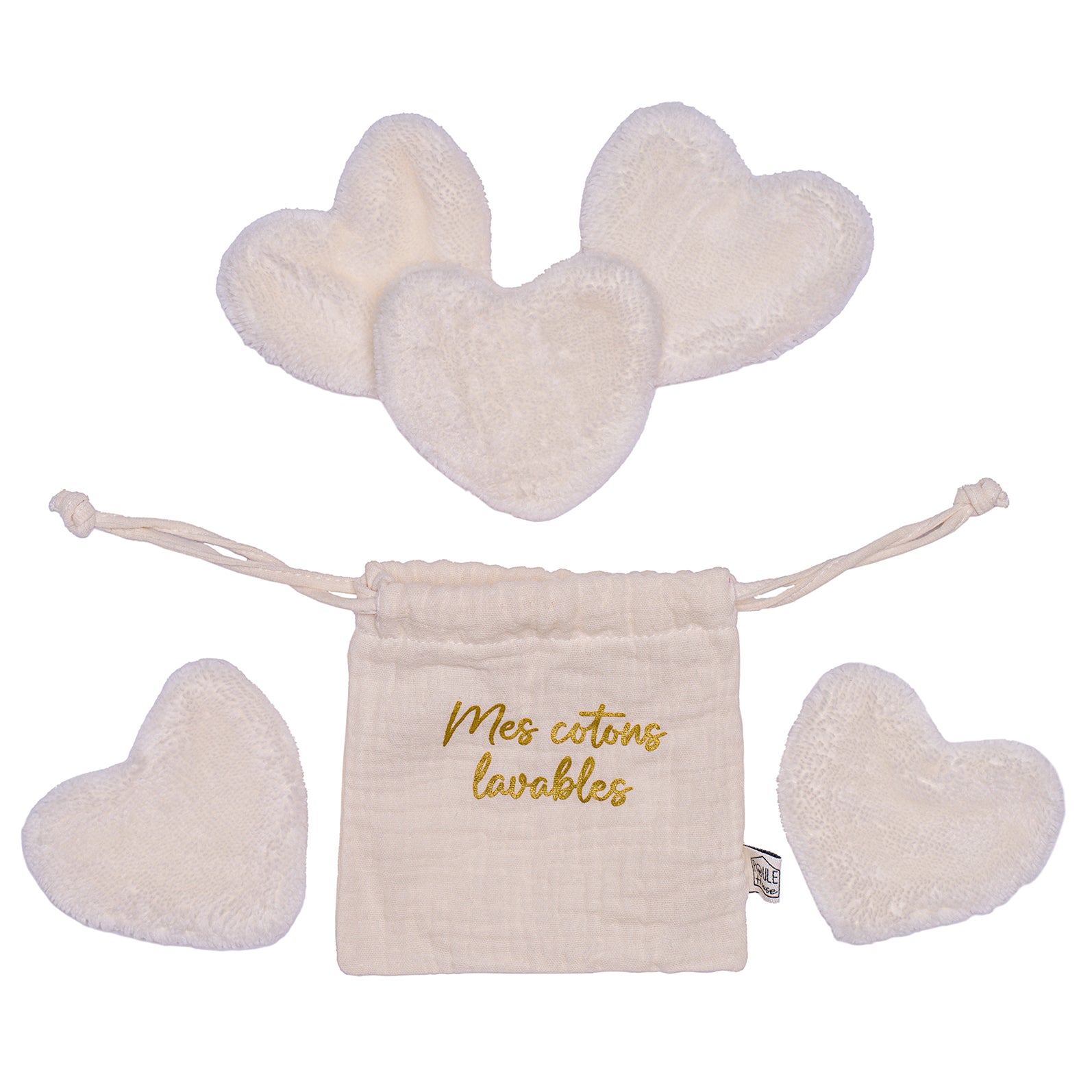 Set 5 cotons lavables forme cœur dans pochon - lait