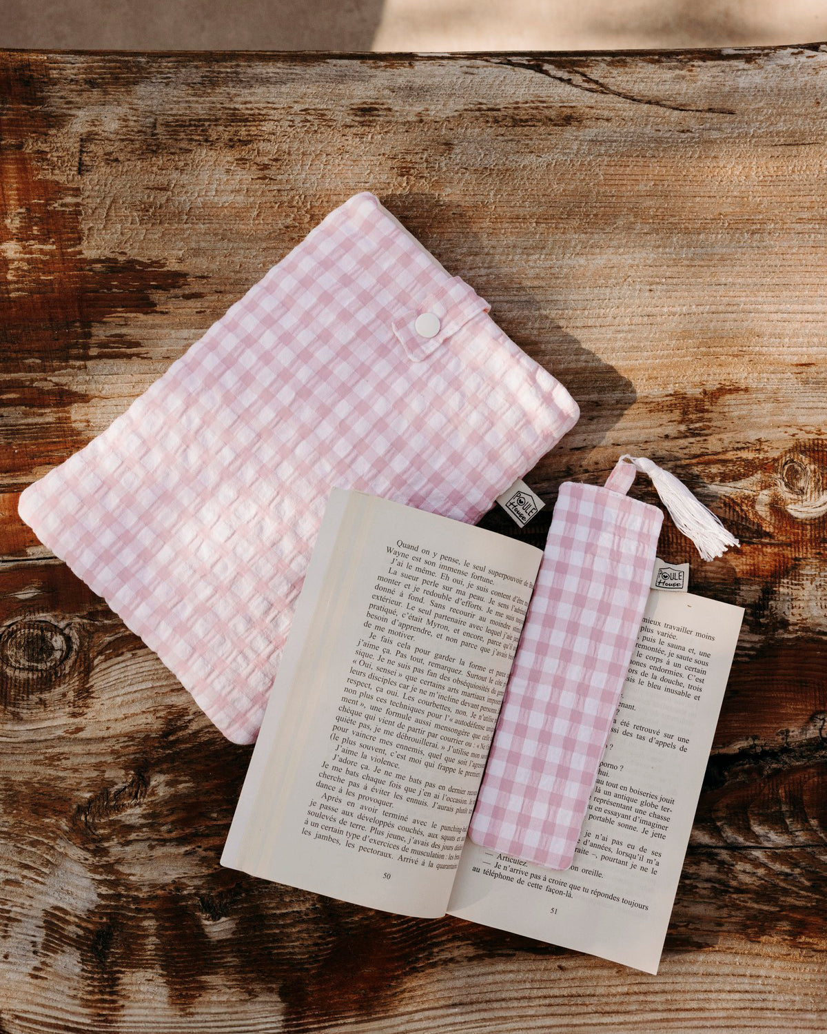 ✔ Duo coordonné qui fait son effet : pochette + marque-page assortis en vichy rose doux et intemporel